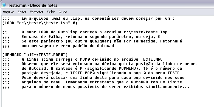 Veja que na primeira linha válida do arquivo TESTE.MNL é feito o carregamento do arquivo C:\TESTE\TESTE.LSP Na segunda linha válida está a chamada que irá apresentar o menu do aplicativo na décima quinta posição da linha de menus do AutoCAD. Este fragmento do arquivo TESTE.MNU mostra o que será exibido neste popmenu: ***POP0 ID_T000 [TESTE] ID_T101 [Ícones 1]^C^Ct1 ID_T201 [Ícones 2]^C^Ct2 ID_T301 [Ícones 3]^C^Ct3 ID_T401 [Ícones 4]^C^Ct4 [--] [->Sobre...] [Escrito por Eduardo Fernal] [<-http://www.gr-acad.com.br]