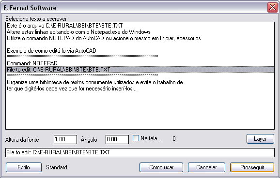 Esta rotina lê as linhas do arquivo C:\E-RURAL\BBI\BTE\BTE.TXT e as insere neste quadro de diálogo, para permitir que você selecione uma delas. Defina a altura do texto, o ângulo desejado, a camada. Clique 'Prosseguir' e selecione um ponto de inserção deste texto. Você poderá também digitar (ou alterar) a linha, no campo 'edit_box' do quadro de diálogo...