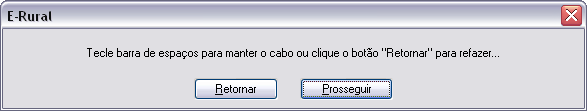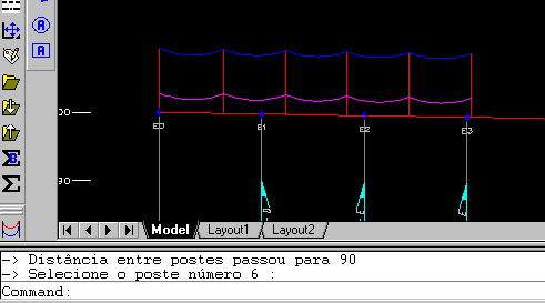Selecionado este poste, a rotina lança o seguinte, na distância informada, traçando o cabo, e apresenta o quadro de diálogo seguinte... Caso o vão especificado tenha sido excessivo, clique sobre o botão 'Retornar' para que a distância seja diminuida e cabo recalculado...