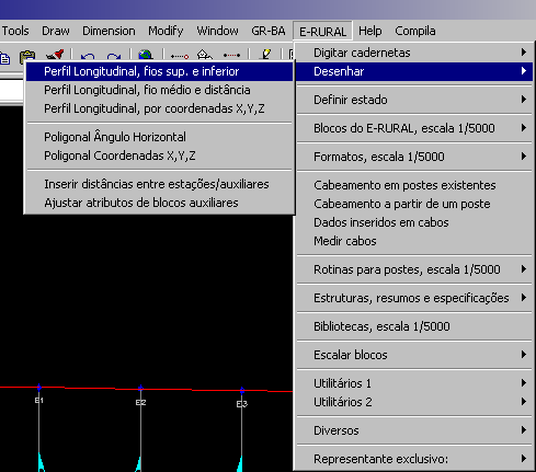 Para desenhar o perfil, devemos escolher uma das rotinas do E-RURAL no menu do aplicativo, linha 'Desenhar' ou então digitar o nome do comando da rotina desejada. Para conhecer os nomes destes comandos, clique aqui...