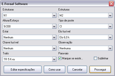 Especifica os postes existentes no perfil, definindo o tipo de estrutura. Ao chamar o comando, o quadro de diálogo da figura a seguir será apresentado: selecione as opções de especificação, clique o botão 'Prosseguir' e selecione os postes a especificar...