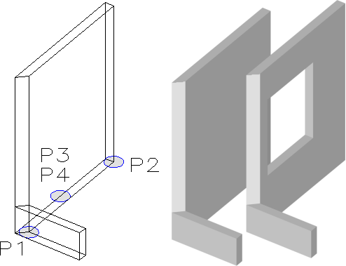 Abre um objeto '3DSOLID' em posição adequada para ser subtraido de uma parede 3D, desde que esta seja um objeto '3DSOLID'. Você deverá usar o comando SUBTRACT do AutoCAD© para fazer esta abertura, após a inserção do objeto a ser subtraido. Siga a sequência dos pontos mostrados na imagem...