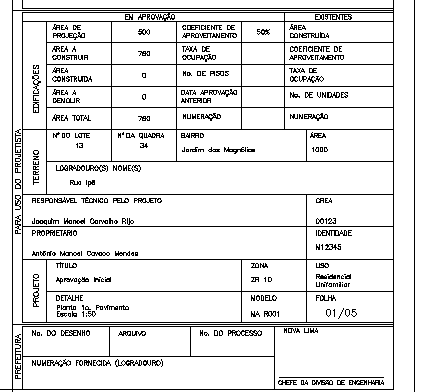 Esta rotina estará sempre em crescimento, à medida em os usuários cadastrados do Gr-Arqui fornecerem os formatos utilizados pelas prefeituras de suas cidades os enviarem. Serão criados blocos atributados e quadros de diálogos com as máscaras destes atributos, para uma inserção rápida e correta destes formatos...