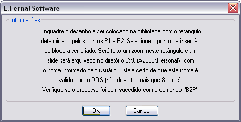 Permite criar um bloco e, a partir deste, um wblock, gerando ainda o slide para visualização posterior com o comando B2P. Para a criação de uma biblioteca pessoal, salvando partes de desenhos para posterior utilização.