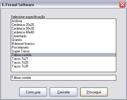 Esta rotina solicita a seleção de polilinha fechada, um ponto interno (ou externo, se preferir) e em seguida apresenta o quadro de diálogo abaixo, no qual você determina a especificação do material de piso. A rotina então irá inserir um bloco com 3 atributos, com esta especificação, a área da polilinha e seu perímetro. Especificadas todas as polilinhas, utilize o comando QTOTAL para gerar a planilha quantitativa, que também listará as especificações de tetos, estas inseridas com o comando QTETOS. As especificações listadas provêem de um arquivo de texto, que pode ser editado para inserir outros materiais...