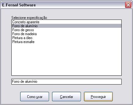 Esta rotina solicita a seleção de polilinha fechada, um ponto interno (ou externo, se preferir) e em seguida apresenta o quadro de diálogo abaixo, no qual você determina a especificação do material do teto. A rotina então irá inserir um bloco com 3 atributos, com esta especificação, a área da polilinha e seu perímetro. Especificadas todas as polilinhas, utilize o comando QTOTAL para gerar a planilha quantitativa, que também listará as especificações de tetos, estas inseridas com o comando QPISOS. As especificações listadas provêem de um arquivo de texto, que pode ser editado para inserir outros materiais...