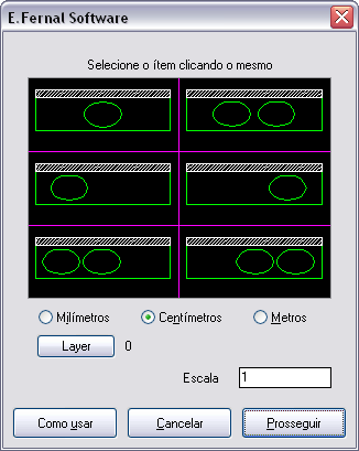 Permite inserir uma polilinha representando uma bancada e já inserir cuba(s), em um dos modelos do quadro de diálogo. Necessita que as linhas representando o compartimento estejam presentes, pois a rotina solicita que se clique 2 vezes a parede do fundo e, em seguida, a parede à esquerda e a parede à direita. Siga as instruções na linha de comandos do AutoCAD©.