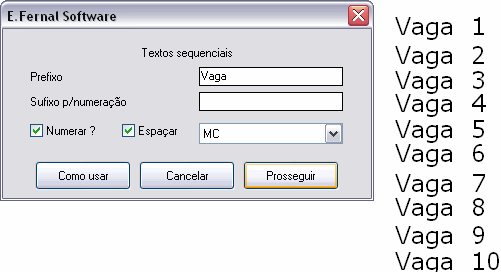 Permite criar textos com um sufixo(opcional) e/ou prefixo (obrigatório), com numeração sequencial, em pontos clicados sequencialmente. A rotina pergunta o número inicial e irá incrementando este número em 1, a cada ponto fornecido. Para identificar vagas em garagens, salas em edifícios comerciais, etc...