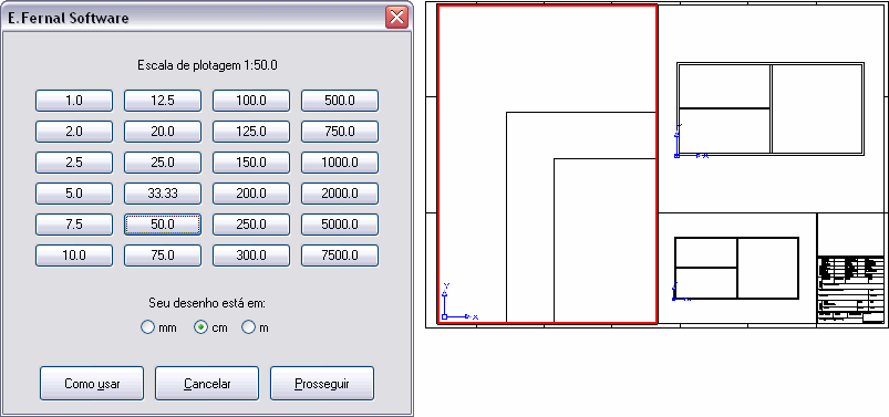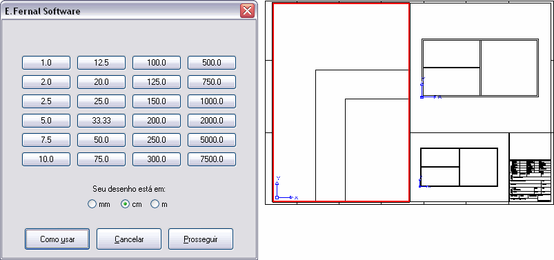 Esta rotina foi desenvolvida para desmitificar o uso do Paper Space. Utilize em conjunto com a rotina PREFEITURAS, que insere blocos desenhados em mm, nas escalas X=1 e Y=1. Crie suas 'VIEWPORTS' e em seguida, utilize este comando para ajustar o desenho no tamanho correto, sem ter que se preocupar com a escala XP do desenho. A rotina só irá funcionar no ambiente de Paper Space (Layout) e, neste, estando uma ViewPort ativa. Caso contrário, a rotina emitirá mensagens informando porque não pôde se completar. No exemplo abaixo vemos um formato inserido com o comando PREFEITURAS. Neste formato foram abertas 3 ViewPorts, estando ativa a primeira. A rotina ZXP, acionada, apresenta o quadro de diálogo como visto à esquerda da figura 1. Informamos se o desenho está em mm, cm ou metros e, em seguida, clicamos sobre o botão que indica a escala desejada para esta janela (figura 2). O resultado pode ser visto na figura 3.