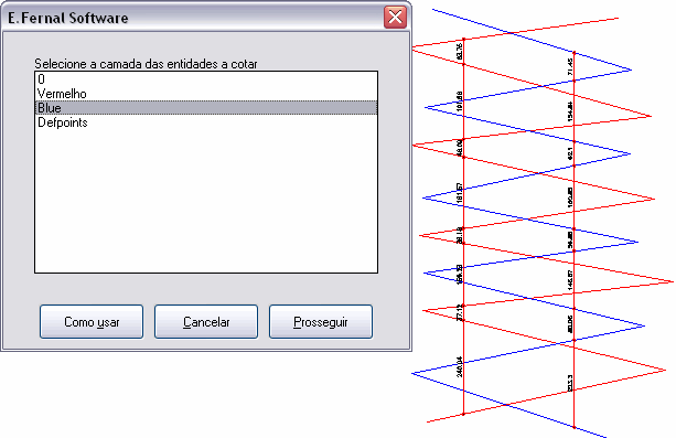 Cota verticalmente múltiplos vãos de linhas e/ou polilinhas de uma camada informada através de um quadro de diálogo, no início da rotina... Na figura acima, primeiro foi selecionada a camada 'Vermelho' e, em seguida, a camada 'Blue'. A rotina pede um ponto inicial e um ponto final, filtra as entidades encontradas e cota os vãos entre as entidades encontradas, desde que estas sejam da camada informada previàmente...