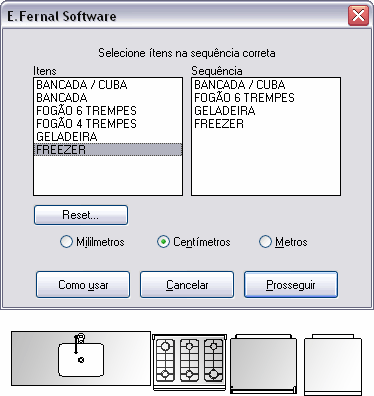 Insere peças de cozinha linearmente, de acordo com a sequência de montagem fornecida através de um quadro de diálogo.