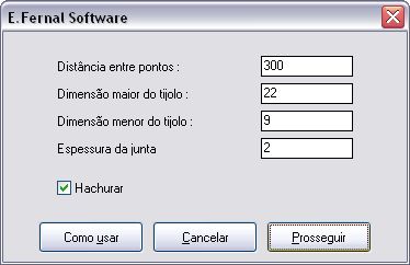 Esta rotina solicita os pontos inicial e final de uma parede. Em seguida, abre o quadro abaixo, para fornecimento dos parâmetros. Isto feito, desenha uma fieira de tijolos, como visto na imagem acima...