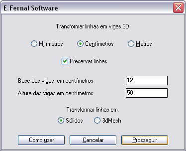 Permite o desenho de vigas (ou outra destinação) a partir de linhas (entidade 'LINE') existentes em seu desenho. Basta entrar com os parâmetros no quadro de diálogo da figura acima e selecionar as linhas...