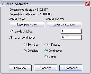 Após selecionar o arco geratriz da esquadria em curva, preencha os dados do quadro de diálogo da figura acima... Para aplicar o acabamento, carregue antes o material 'Blue Glass', com o comando 'Finish' do AutoCAD©