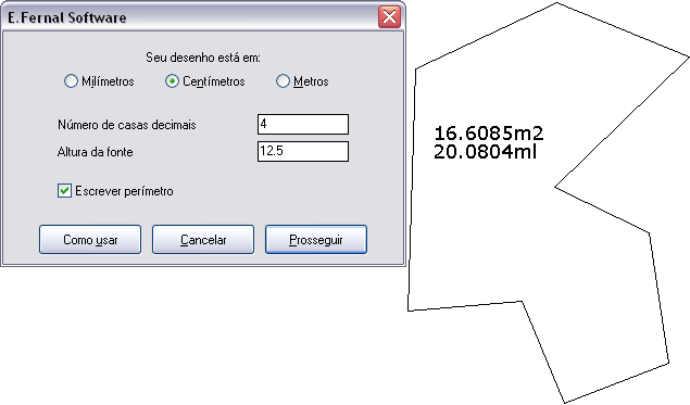 Calcula a área e perímetro de polilinhas e escreve o resultado.