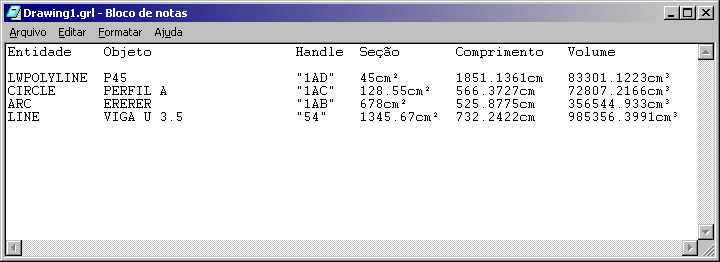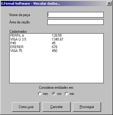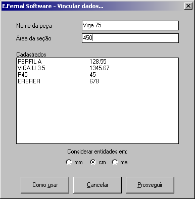 O usuário entra com um nome qualquer e uma seção em mm2, cm2 ou m2, podendo cadastrar estes dados em um arquivo externo para posterior reutilização. Em seguida irá selecionar as entidades que representam as peças cujos volumes deseja quantificar, inserindo estes dados nestas entidades. Isto feito, será utilizado o comando para cálculo dos volumes, podendo a relação de peça a peça ser enviado para um arquivo externo com extensão .GRL ou então decidir-se pelo