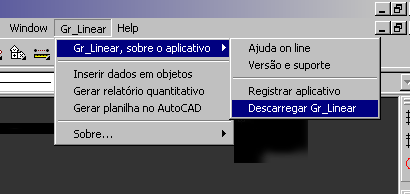 Para acessar os comandos do aplicativo Gr_Linear, você pode usar a barra de ferramentas, o menu superior ou a linha de comandos do AutoCAD®, entrando com os nomes GRL-VINC, GRL-TXT, GRL-AUT. Estes são os comandos principais do aplicativos, e os modos de utilização estão descritos neste arquivo de ajuda. Para acessar cada um deles, clique sobre a barra de ferramentas da figura acima ou na figura do menu Pop-Down.