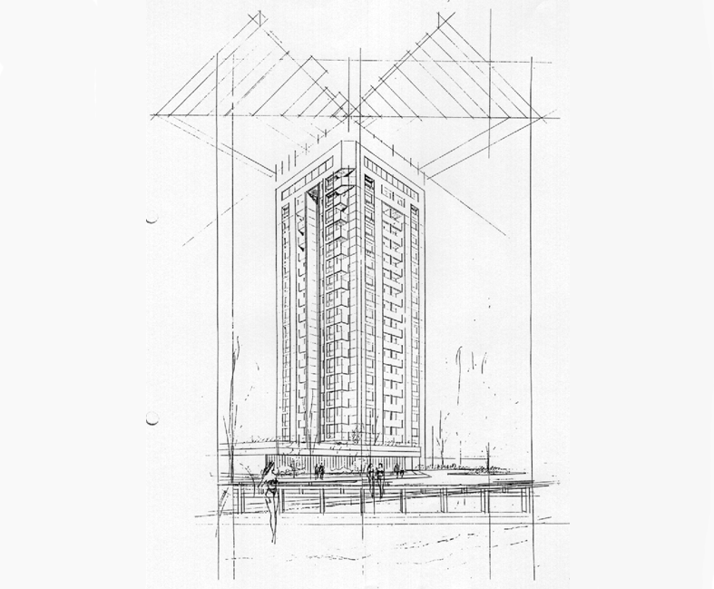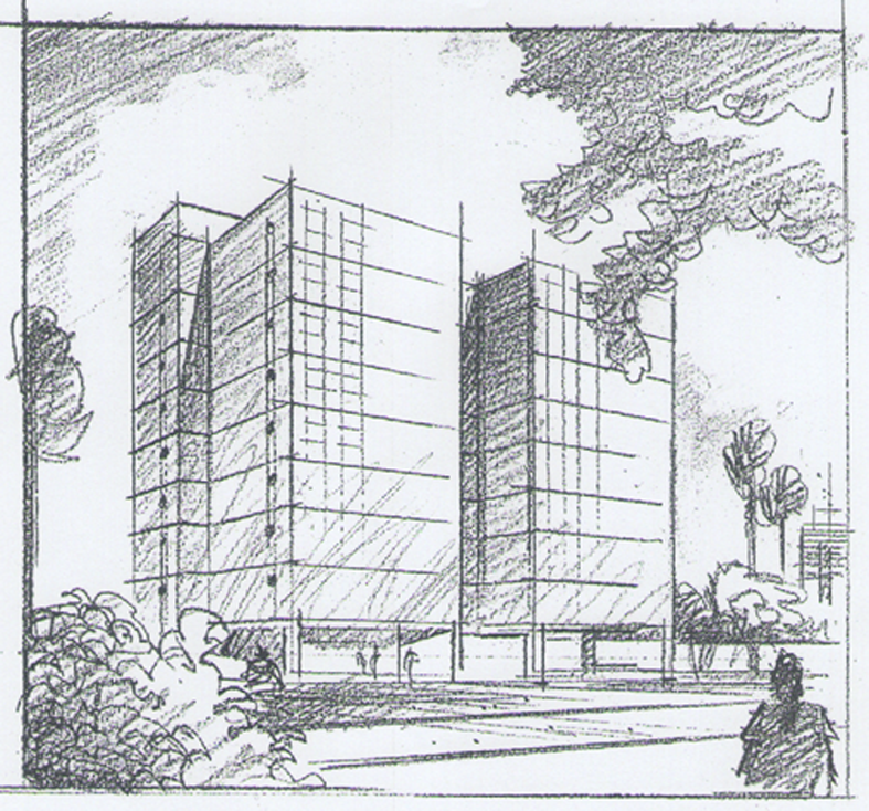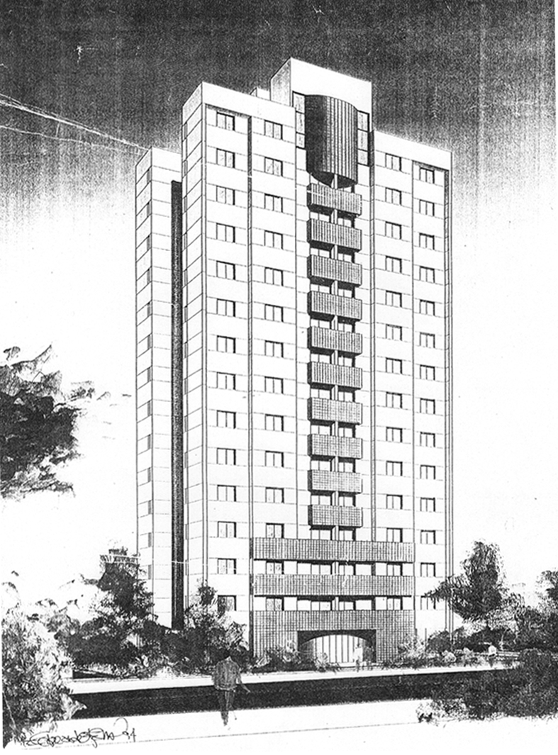Meu último projeto de arquitetura (perspectiva do grande Nelson Sadalla, RJ). Ficou nas fundações por 18 anos, pela quebra das construtoras.