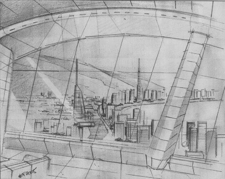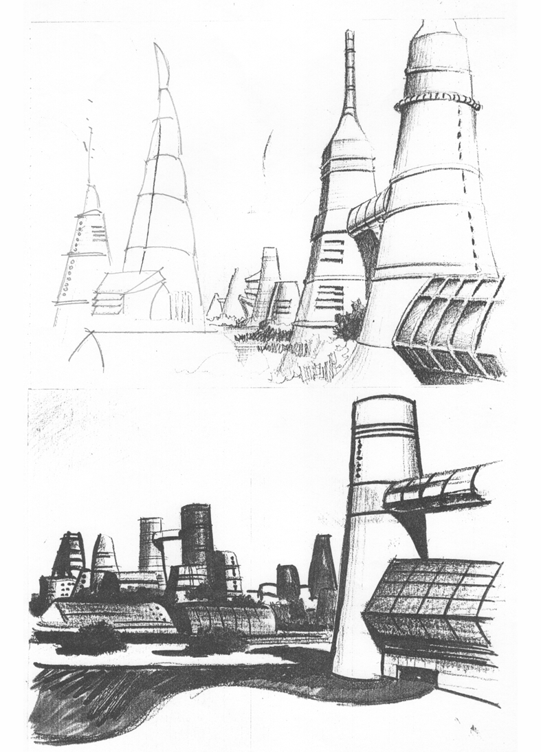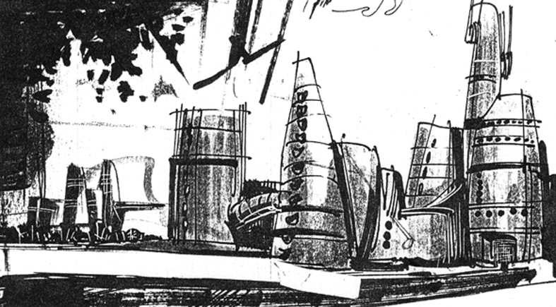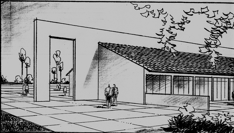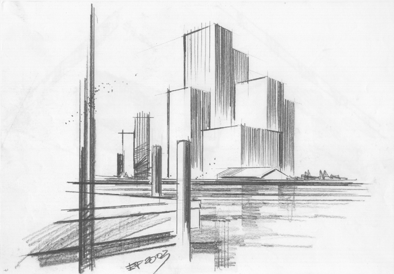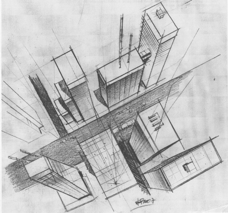 Outra perspectiva para um trabalho de projeto arquitetônico de alunos (grupo de 4 estudantes). Xerox escaneado de um desenho de 20 minutos, feito com grafite 6B.