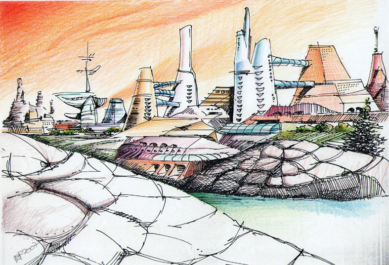 Esta perspectiva foi desenhada em papel vegetal e colorida com aerógrafo, com tinta nanquim em cores. Enrugou um pouco, mas nada em excesso.